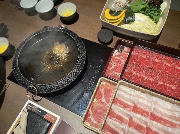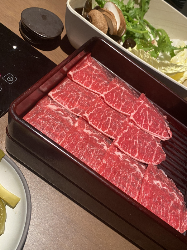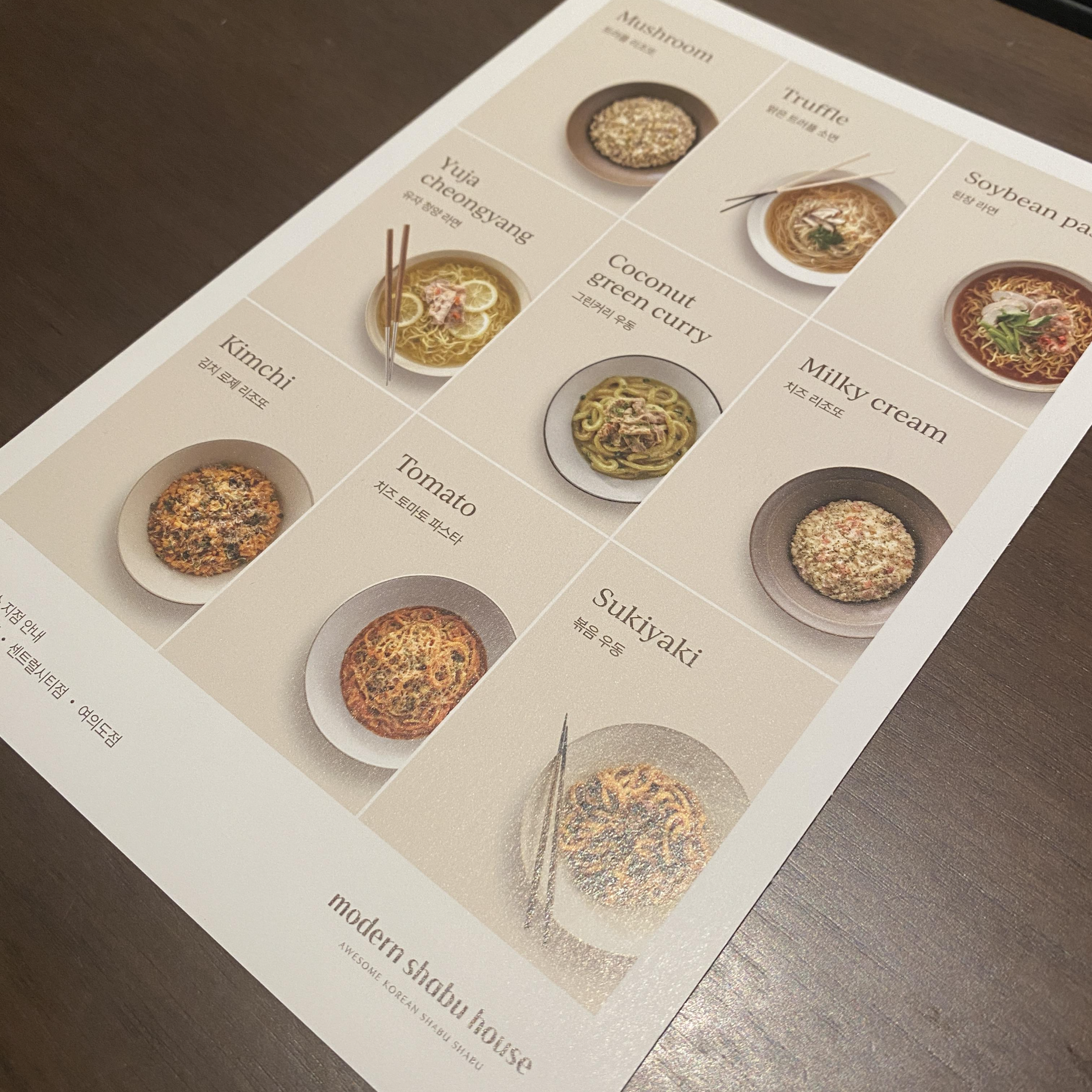 아니면 메뉴를 두 장 주시면 괜찮았을텐데 그렇지도 않았다. 앞 뒤로 열심히 돌려 가며 원하는 육수를 선택하는데 고군분투해야 했다. 육수 선택하는데 글 다 읽어 보고, 식사 메뉴 다 맞춰서 확인하고, 이렇게 신중해 본 적이 없다. 매운 육수가 한 두 가지 있었던 것 같은데 맵기의 수준을 가늠하기도 어려웠고 서로 입맛이 다 다르니 호불호 없는 중간 맛인 스키야키를 선택했다. 나중에 나오는 식사가 볶음 우동인 것도 마음에 들었다. 코코넛 그린 커리나 유자 청양 육수는 어떤 맛일지 궁금하기는 하다. 토마토 육수 역시 마이너해 보이기는 해도, 고수 훅 얹어서 주시면 완전 맛있을 것 같은데 여럿이 먹는 샤브샤브라 서로의 취향을 이해해줄 구성원을 모아 먹는 것 또한 어려운 일일 것 같다. 개인적으로는 토마토 육수 너무 사랑한다. 20년도 더 전에 베트남에서 먹었던 토마토 국이 입에 참 잘 맞았는데, 이런 입 맛 가진 사람 찾기 쉽지 않다.