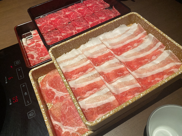 기본 시그니처를 선택하면 소고기는 부채살과 알목심, 돼지고기는 목살과 삼겹살이 나온다. 고기와 채소 모두 먹으면서 계속 추가해서 먹을 수 있고, 고기를 새로 추가 주문할 때에는 특정 부위를 선택해 주문할 수 있어서 일단 맛을 보고 나서는 거의 소고기를 주문해 먹었다. 돼지 고기는 약간 잡내가 나기도 했다. 소스를 찍어 먹어도 냄새가 가려지지는 않았다.