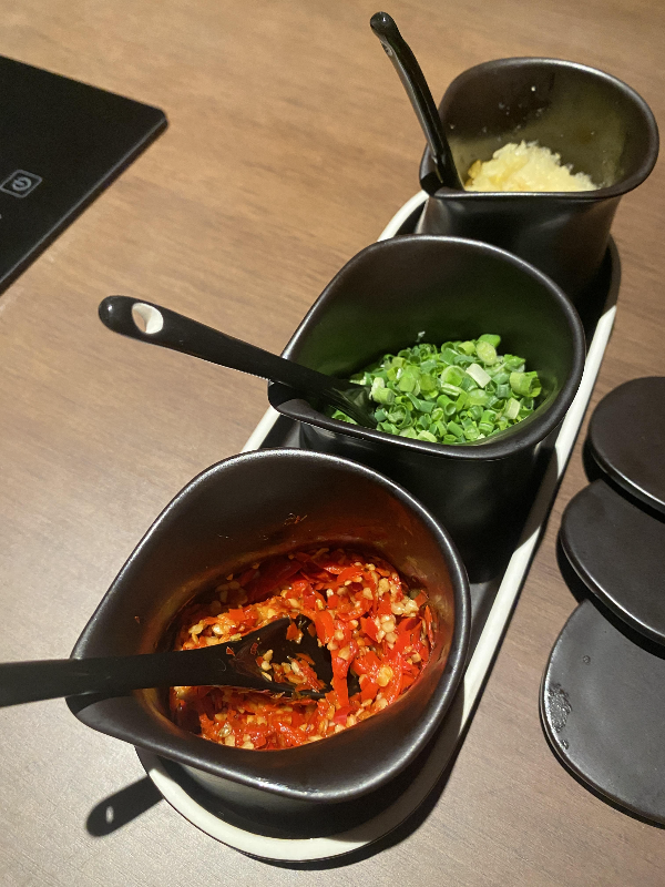약간 단 맛이 있는 스키야키 육수라 너무 반갑지는 않았고, 고기를 날달걀에 찍어 먹을 수 있도록 날달걀이 따로 나와서 날달걀의 비릿함과 돼지고기의 누릿함을 한꺼번에 즐길 수 있다. 소스 종류에 따라 태국 고추와 파, 마늘을 각각 섞어 드시라 안내해 주셨지만 소스는 뭐, 향신료는 한꺼번에 다 넣고 맛 보는 타입이라 다 섞어서 잘 먹었다. 어떻게 각각의 소스마다 한 가지 양념만 넣을 수 있겠는가!